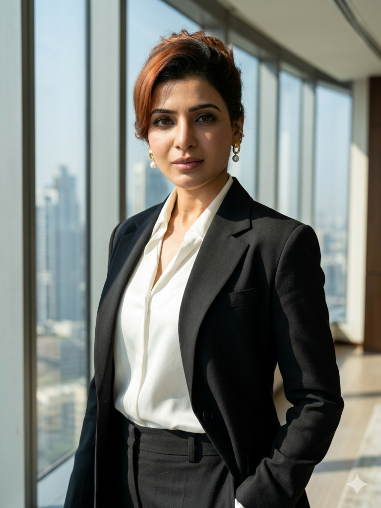 Ultra-HD portrait of a confident woman in a tailored black power suit with a silk blouse, standing in a luxury office with floor-to-ceiling windows, soft sunlight streaming in, sharp facial features, elegant hairstyle, minimal jewelry, photorealistic skin texture, cinematic lighting, high fashion editorial, 8K resolution.