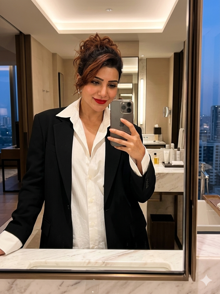 Ultra-HD mirror selfie of a confident rich woman wearing an oversized white shirt slightly unbuttoned with a structured blazer, holding a premium smartphone, minimal makeup with bold lips, sharp eyes, messy but intentional hair, luxury penthouse background, warm ambient lighting, clean aesthetic, no clutter, powerful and unapologetic vibe, ultra-realistic skin texture, 8K, editorial fashion photography.