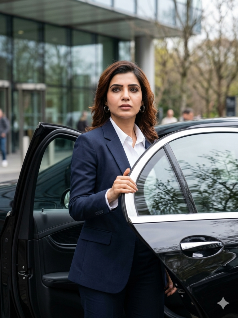 Ultra-detailed image of a professional woman in a navy tailored suit stepping out of a luxury car, holding the door, composed and focused expression, modern office building in background, soft natural lighting, realistic motion capture, sharp fabric details, no glam exaggeration, 8K ultra HD, cinematic but realistic.