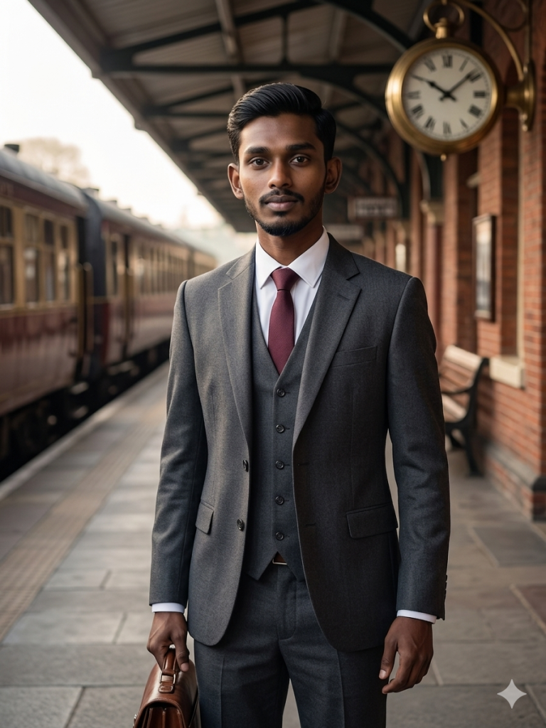 Ultra-HD image of a well-dressed man standing on a quiet train platform, wearing a perfectly tailored three-piece wool suit, crisp white shirt, tie neatly knotted, polished leather shoes, holding a classic briefcase, hair neatly combed, clean-shaven or well-groomed beard, calm and composed expression, soft morning light, minimal background distraction, realistic textures, 8K ultra realistic, timeless dapper style, editorial fashion photography.