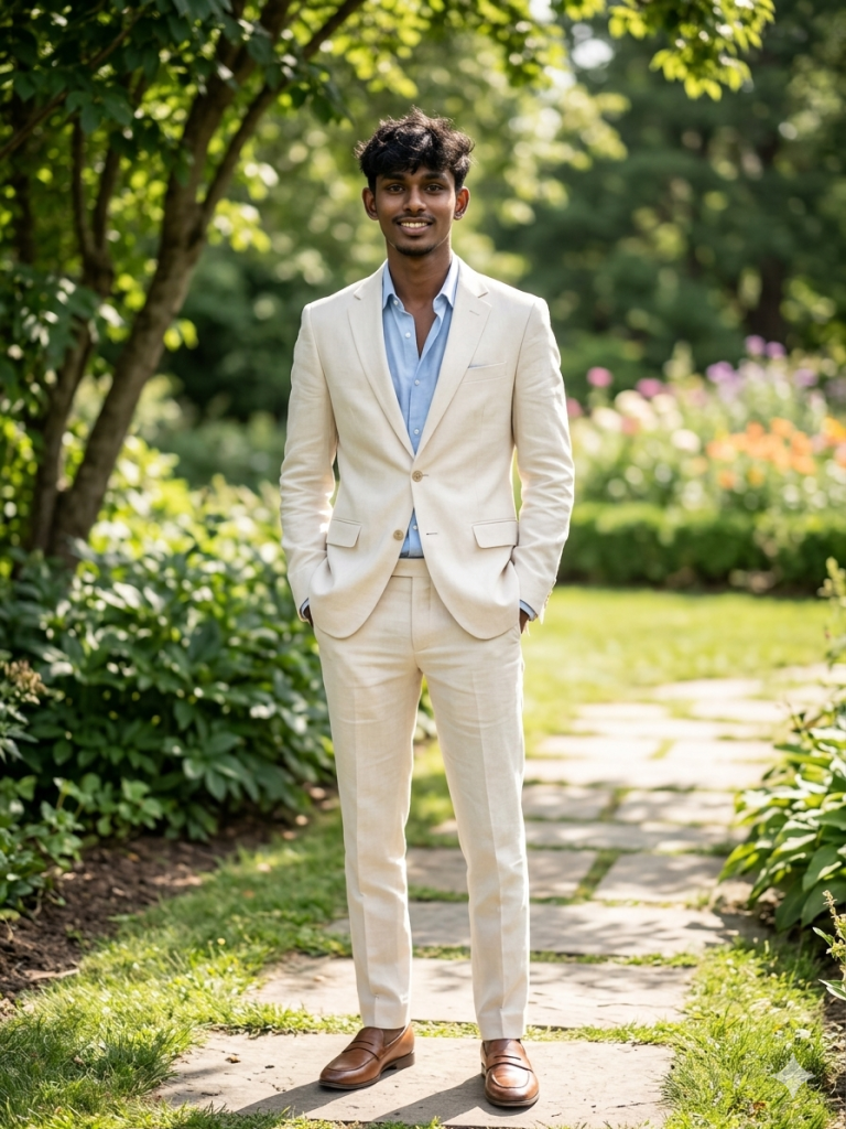 Ultra-realistic full body shot of a man in a beige or cream linen suit, light shirt, loafers, standing outdoors in soft sunlight, relaxed but neat posture, clean grooming, natural environment, subtle shadows, 8K ultra HD, fresh summer dapper style.